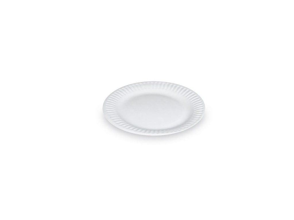 Papírový talíř k podávání teplých pokrmů nebo zákusků. Průměr 15 cm. 100 ks v balení.