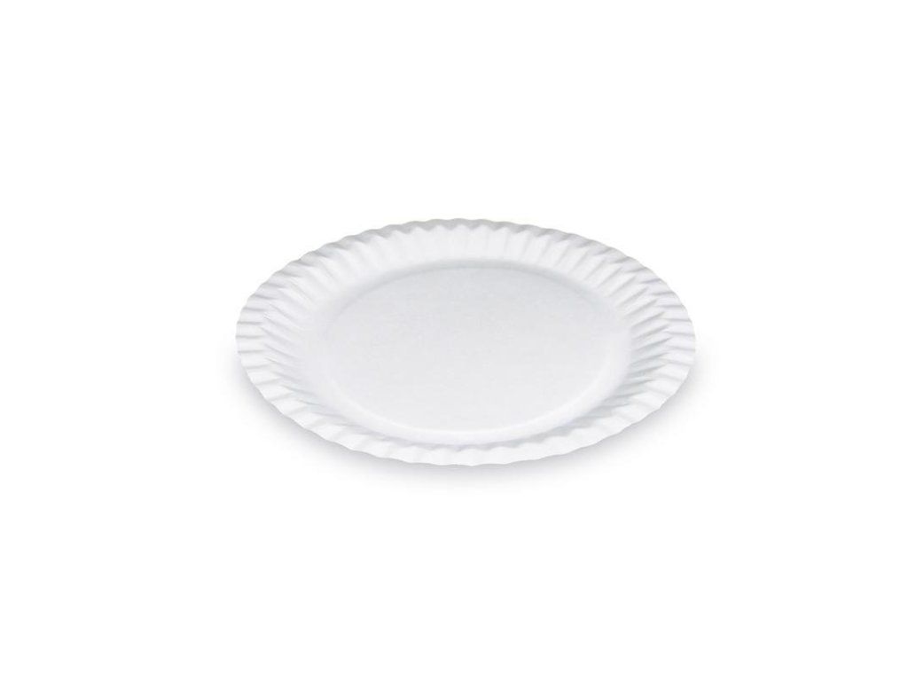 Papírový talíř k podávání teplých pokrmů nebo zákusků. Průměr 23 cm. 100 ks v balení.